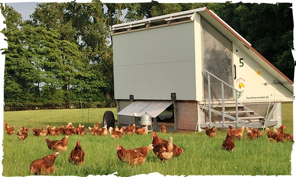 Unsere Hühner leben in Hühnermobilen und werden wöchentlich auf frisches Grün umgesetzt. Mehrere Herden sind Doppelnutzungshühner aus ökologischer Tierzucht. Sie legen Eier, werden ein